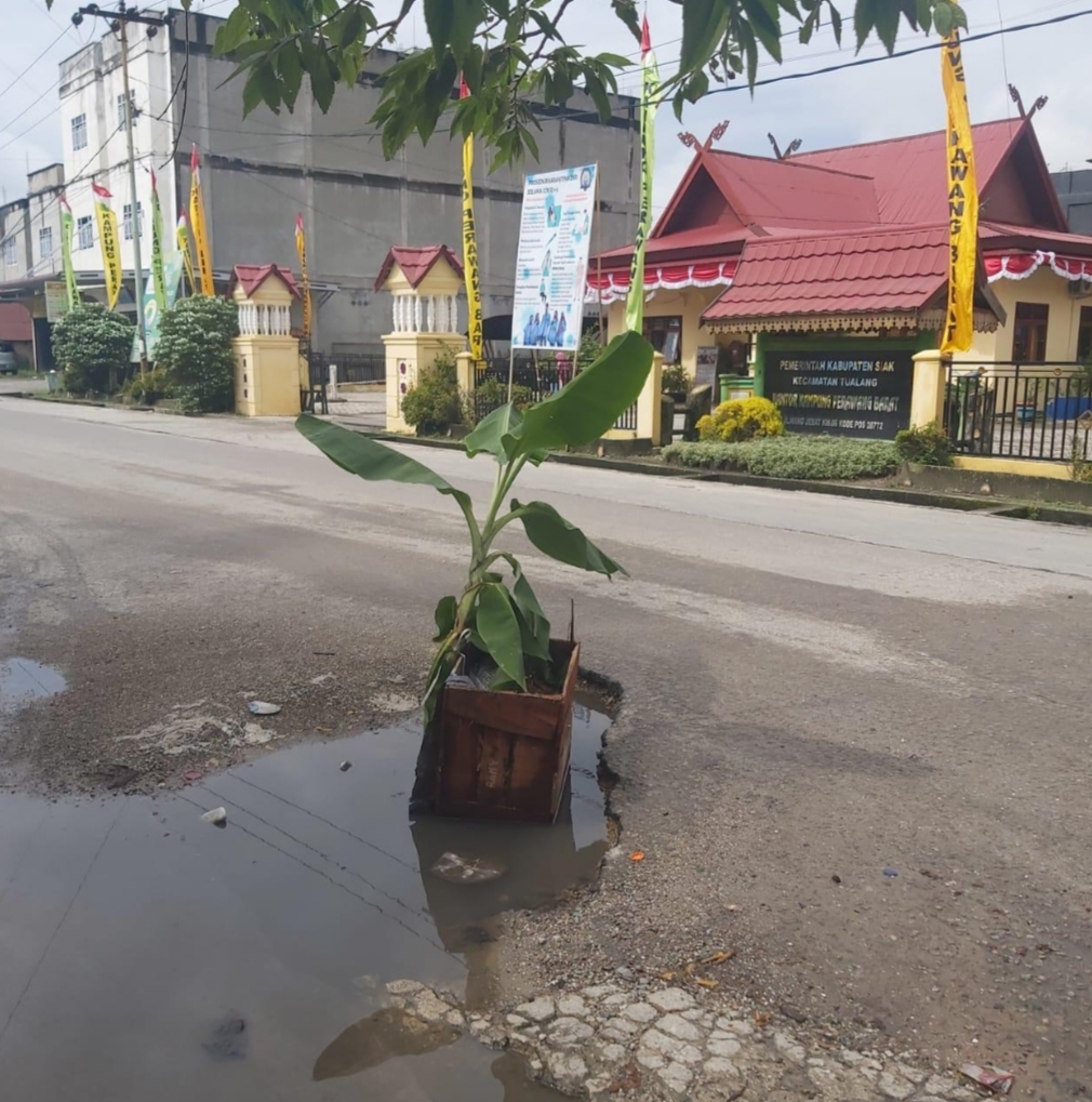 Teleskopnews.com – Jalan M. Ali di desa Tualang Barat ramai dikabarkan karna tertanam pohon pisang di badan jalan yang berlubang dan digenangi air tersebut…