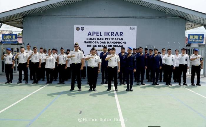 DUMAI – Komitmen pemberantasan narkoba dan penggunaan handphone ilegal kembali ditegaskan oleh jajaran Rumah Tahanan Negara Kelas IIB Dumai. Seluruh pegawai menggelar apel dan ikrar bersama menolak peredaran narkoba serta handphone ilegal (halinar), Senin (20/4), di lapangan serbaguna Rutan Dumai.