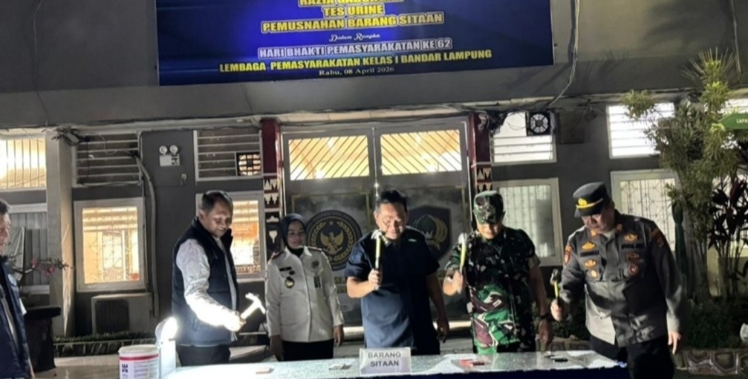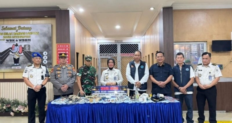 BANDAR LAMPUNG – Menyemarakkan peringatan Hari Bakti Pemasyarakatan, Lembaga Pemasyarakatan Kelas 1 Bandar Lampung menggelar kegiatan razia gabungan secara intensif pada malam hari, Senin, 6 April 2026. Kegiatan pengawasan berskala besar ini merupakan wujud kolaborasi langsung dengan Badan Narkotika Nasional Provinsi Lampung, Kepolisian Sektor Labuhan Ratu, dan Komandan Rayon Militer 0410/KBL.